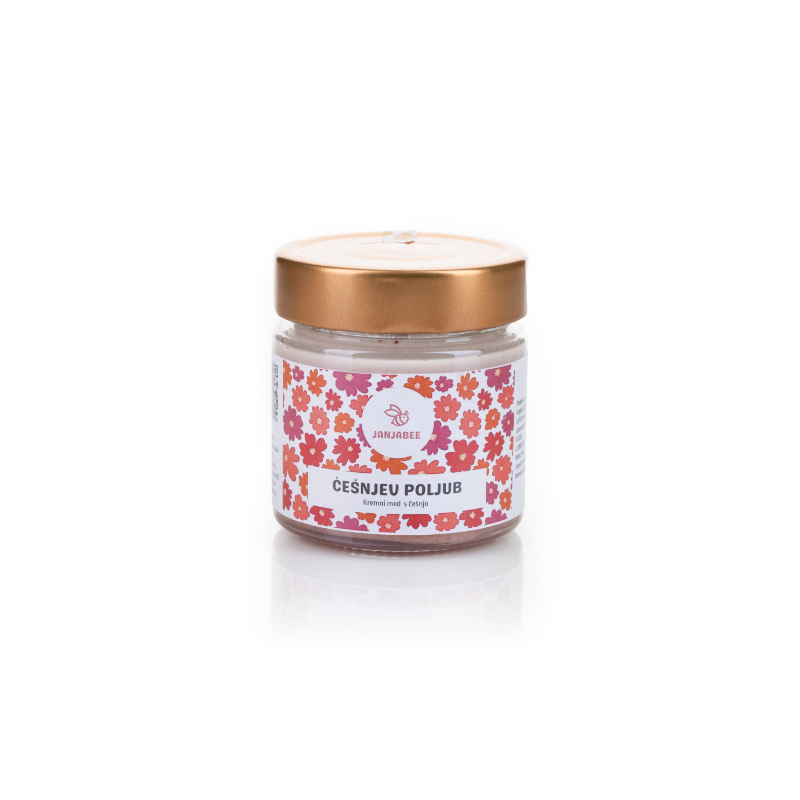 ČEŠNJEV POLJUB združuje previdno kremiran slovenski med in liofilizirano češnjo v očarljiv, sveže-sadni namaz. Liofilizacija ohrani pristno barvo, aromo in nežne kisline češnje, zato vsaka žlička prinese naraven sadni “poljub” – brez dodanih barvil, arom in rafiniranega sladkorja.
