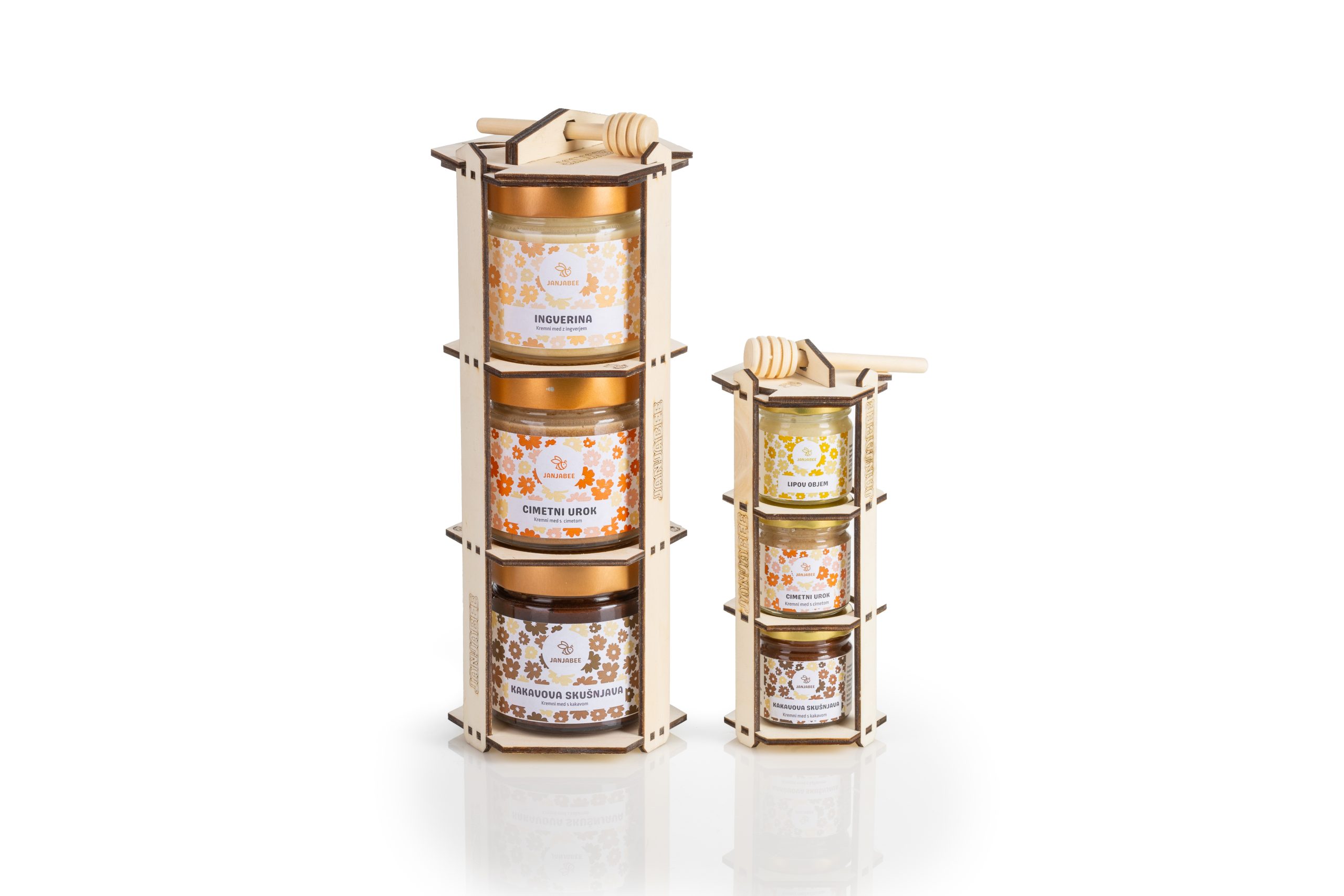 Ta izbrani komplet treh kremnih medov v unikatnem lesenem stojalu z leseno medeno žličko je popolno darilo za ljubitelje naravnih okusov in čebeljih zakladov.